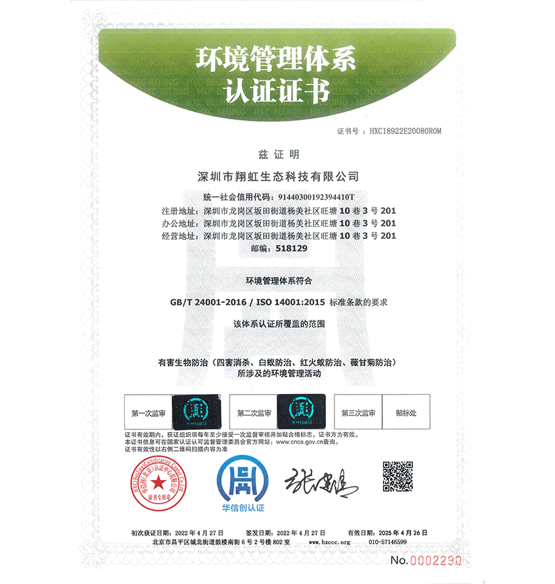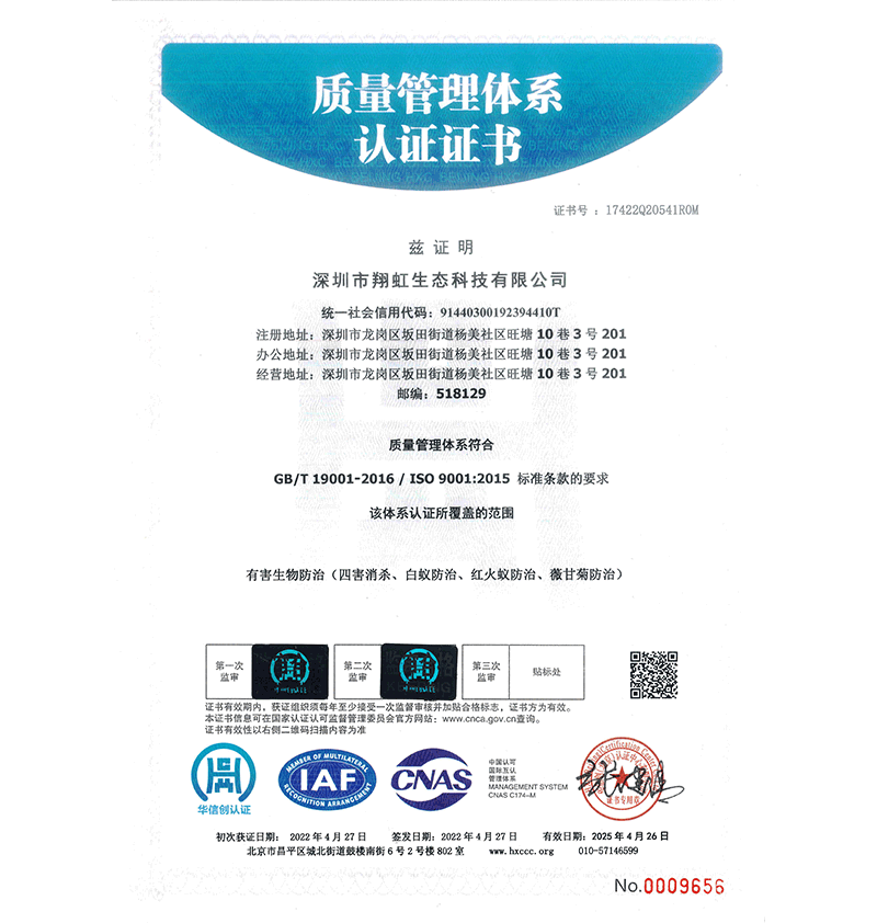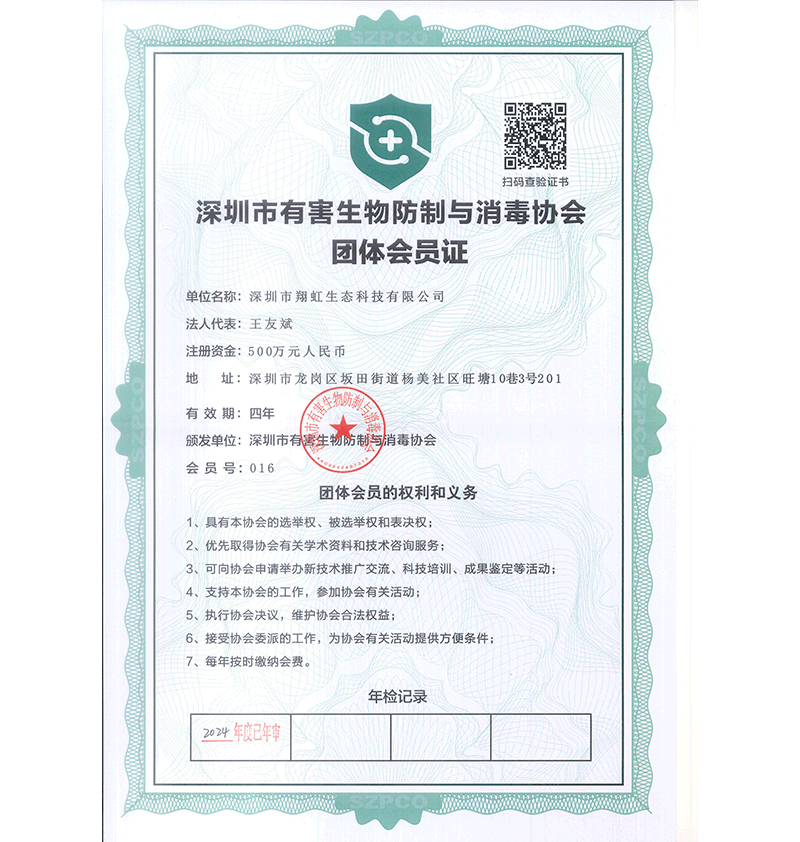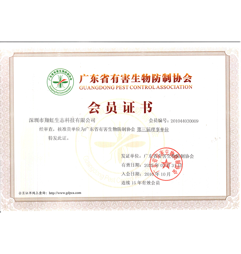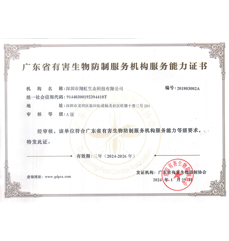 深圳市翔虹生態(tài)科技有限公司成立于1995年,是深圳最早成立的專業(yè)蟲害防治公司之一。公司發(fā)展至今獲得全國有害生物防制服務(wù)A級資質(zhì)、廣東省有害生物防制服務(wù)A級資質(zhì)、深圳市有害生物防制服務(wù)A級資質(zhì)、廣東省有害生物防制服務(wù)A級資質(zhì)、深圳市有害生物防制服務(wù)甲級資質(zhì)的單位,是中國有害生物防治協(xié)會會員、廣東省有害生物防治協(xié)會會員、深圳市有害生物防治協(xié)會理事單位,多次獲得“深圳市十佳消殺單位”榮譽(yù)。